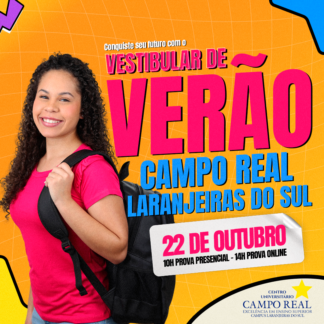 Chegou a hora de aproveitar as oportunidades inscrevendo-se para o vestibular de Verão Campo Real, de forma gratuita, basta acessar https://camporeal.camporeal.edu.br/vestibular-de-verao-2024, escolher o curso e a modalidade de prova, presencial ou online.
